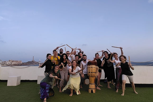 comunitaria y liberación corporal. A través del ritmo, el canto y el movimiento repetitivo, despiertan la memoria del cuerpo, su instinto y su capacidad de celebrar.